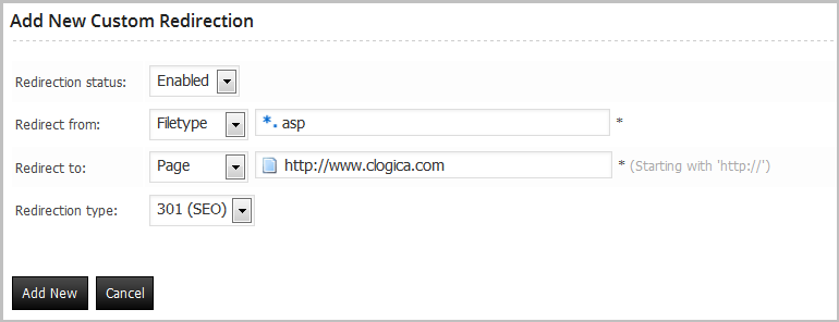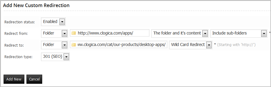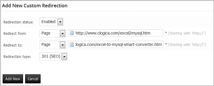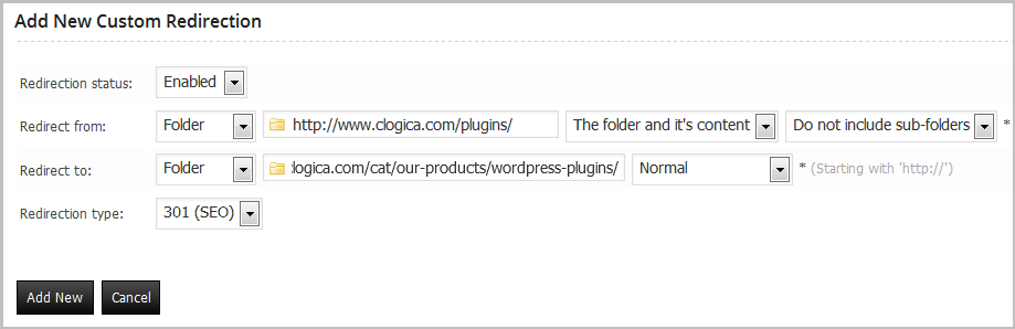 You can download the plugin documentation from: http://www.clogica.com/downloads/documentation/documentation.zipThe simplest redirect, go to custom redirection and click the button “Add New“.