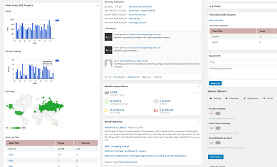 We provide basic analytics that record minutes and views of your videos. Galleries that will be tracked can be selected from the admin easily. There are options for geo map location tracking - this will use the ipinfo API.