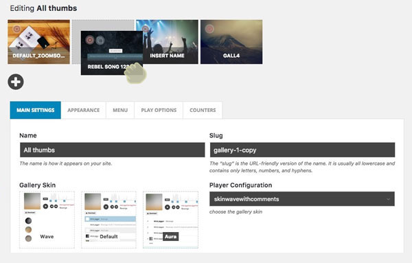 Creating playlists with zoomsounds is easy, peasy. Just create a playlist, and select your customization / skin settings. Integrating into your site frontend is done just by pushing a button and selecting your playlist!